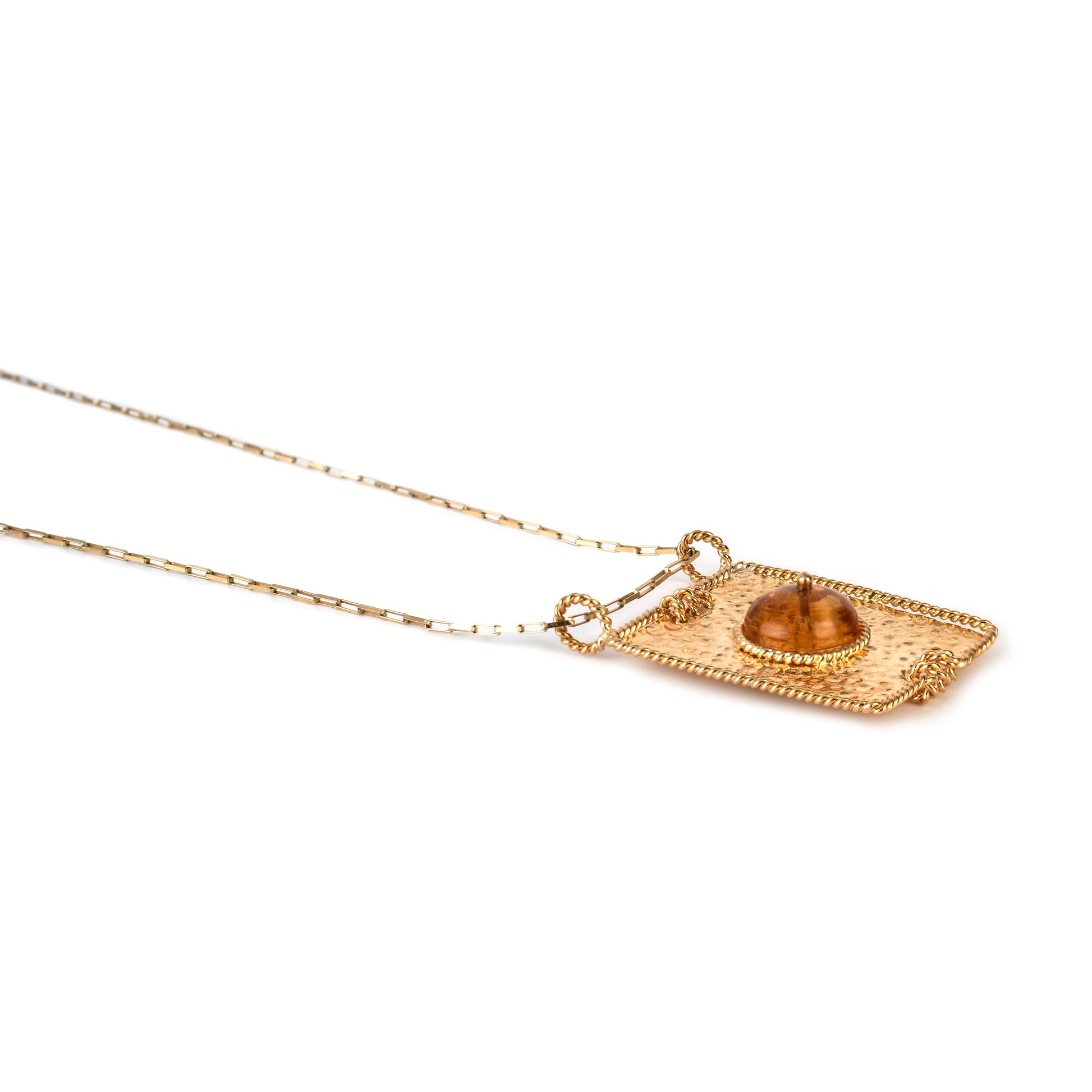 Colar em ouro amarelo 18k com chapa martelada, fios torcidos formando uma moldura e citrino cabochão. Corrente de 50 cm e ajuste em 45cm.
